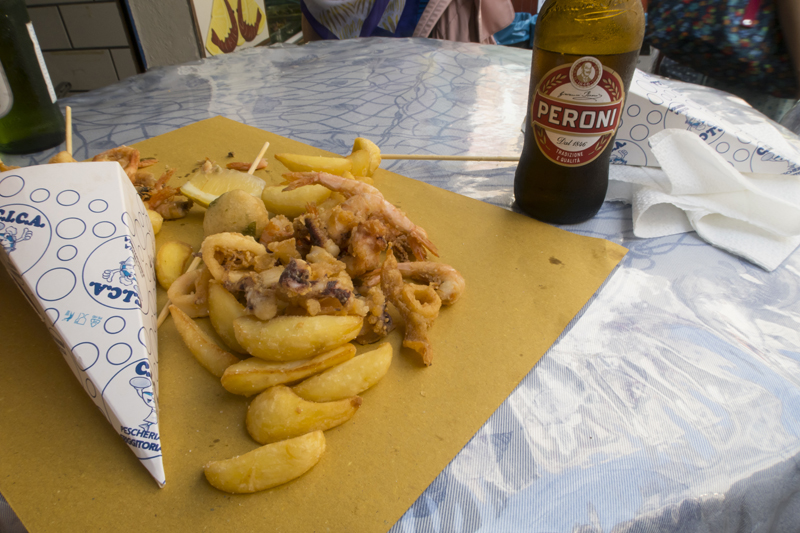 1)Coppo Di Amalfi: Amalfi’ye gitmeden önce bu mekanı aklıma kazımıştım, çünkü burada yenilen yemekler tam bana göre. Kızartma balık ürünleri(karides, kalamar, sardalya vs vs) ve yanında bira. En sevdiğim yemekler atıştırmalık yemekler diyebilirim. Otelimize bavulları attıktan sonra buraya gitmeyi hak etmiştik! 🙂 Google Maps’e Coppo Di Amalfi yazmamıza rağmen bizi bu mekanın başka bir rakibi olan C.I.C.A’ya yönlendirdi. Bu süre zarfı içerinde yeterince acıktığımız için farklı bir yere girdiğimizi fark etmeden siparişlerimizi verdik. İnanılmaz güzeldi, yine açlığın kafama vurduğu anlardan olacak ki, fotoğraf için güzel bir kadraj ayarlamadan direk çekmişim 🙂
